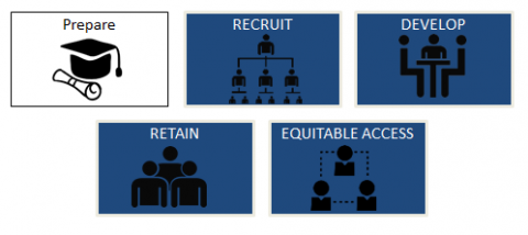 This graphic represents the five common talent management challenges. LEAs may address one or more of the five common talent management challenges of preparing, recruiting, developing, retaining and providing equitable access to the most effective educators using career ladder pathways.