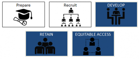 This graphic represents the five common talent management challenges. LEAs may address one or more of the five common talent management challenges of preparing, recruiting, developing, retaining and providing equitable access to the most effective educators using career ladder pathways.