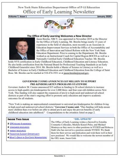 The Office of Early Learning (OEL) publishes its newsletter four times each year, in the winter, spring, summer and autumn. This page lists newsletters and selected topics included within them for the 2019 - 2020 school year.