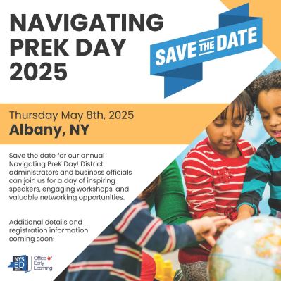 Mark your calendars for the 4th Annual Navigating PreK Day at the NYS Museum in Albany, NY! District administrators and business officials are invited to join the Office of Early Learning for a full day of dynamic speakers, interactive workshops, and meaningful networking opportunities. Check out our flyer for more information and register on Eventbrite here beginning October 2nd.
